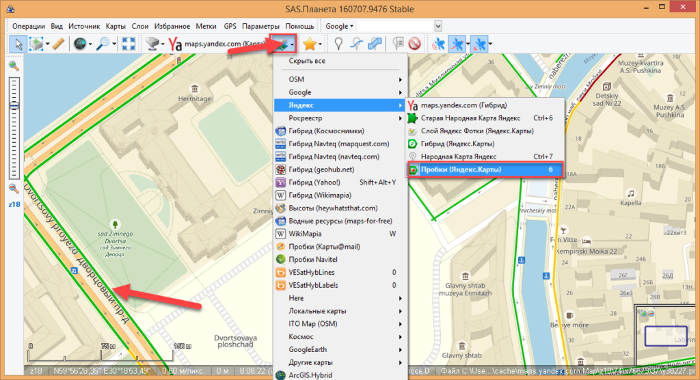 Определением верхнего слоя назначается целевая карта, в примере — Яндекс.Пробки, обозначенные зелёным/жёлтым цветом.