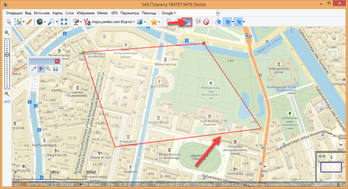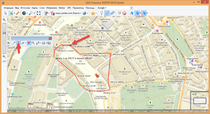 Постройте маршрут по окружности московской Красной площади инструментом Добавления Нового Пути. Сохраните через Enter/дискету. Присвойте имя. Настройте прозрачность (функция расположена внизу справа). Если видите ошибку в построениях, не переделывайте работу, а просто внесите изменения.